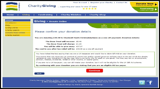 It is also possible to make your payment by calling CharityGiving (The Dove Trust) on 0845 130 3683 (UK local rate at all times). This service is normally 'live' between 9 a.m. and 6 p.m. each weekday. At other times you can leave a message with your callback number. They will take your card information so that your donation can be made to CHC plus tax recovered.